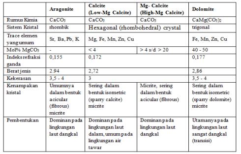 Jenis mineral yang umum dijumpai tersebut mempunyai karakteristik yang tidak jauh berbeda seperti yang ditunjukkan pada tabel di atas. Walaupun ketiganya umum dijumpai pada batuan karbonat namun yang paling umum adalah kalsit khususnya untuk batuan-batuan tua. Hal ini disebabkan karena adanya perubahan atau diagenesa dimana mineral aragonit cenderung berubah menjadi kalsit, seperti yang terlihat pada tabel 2.2.